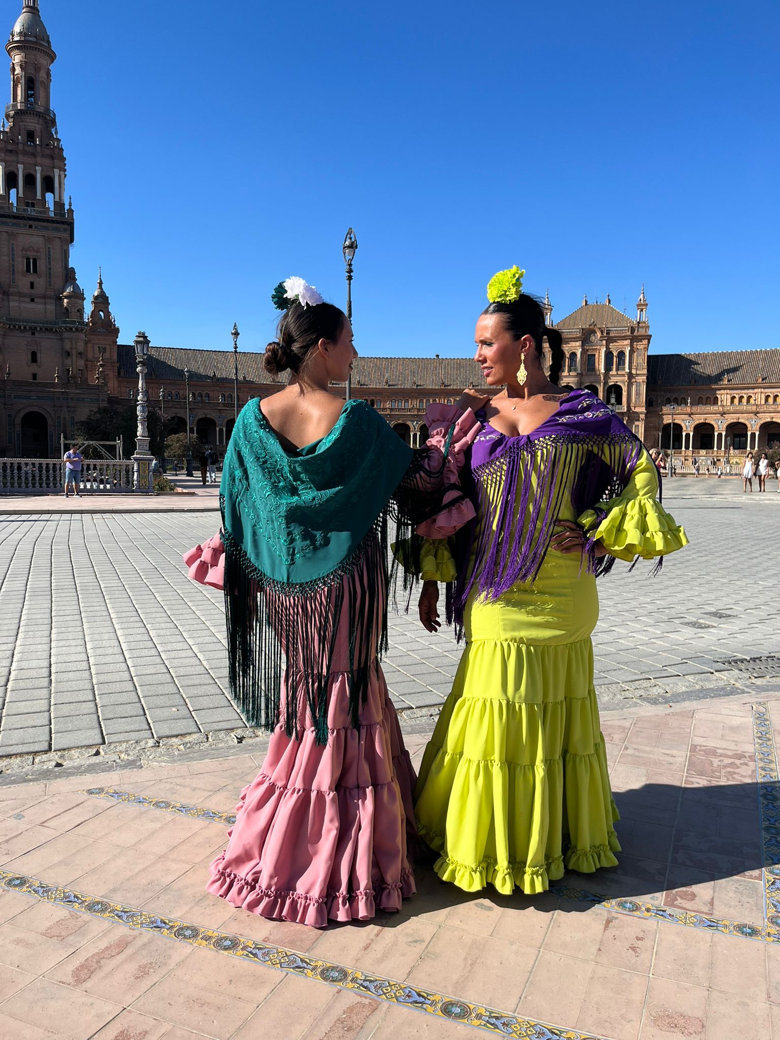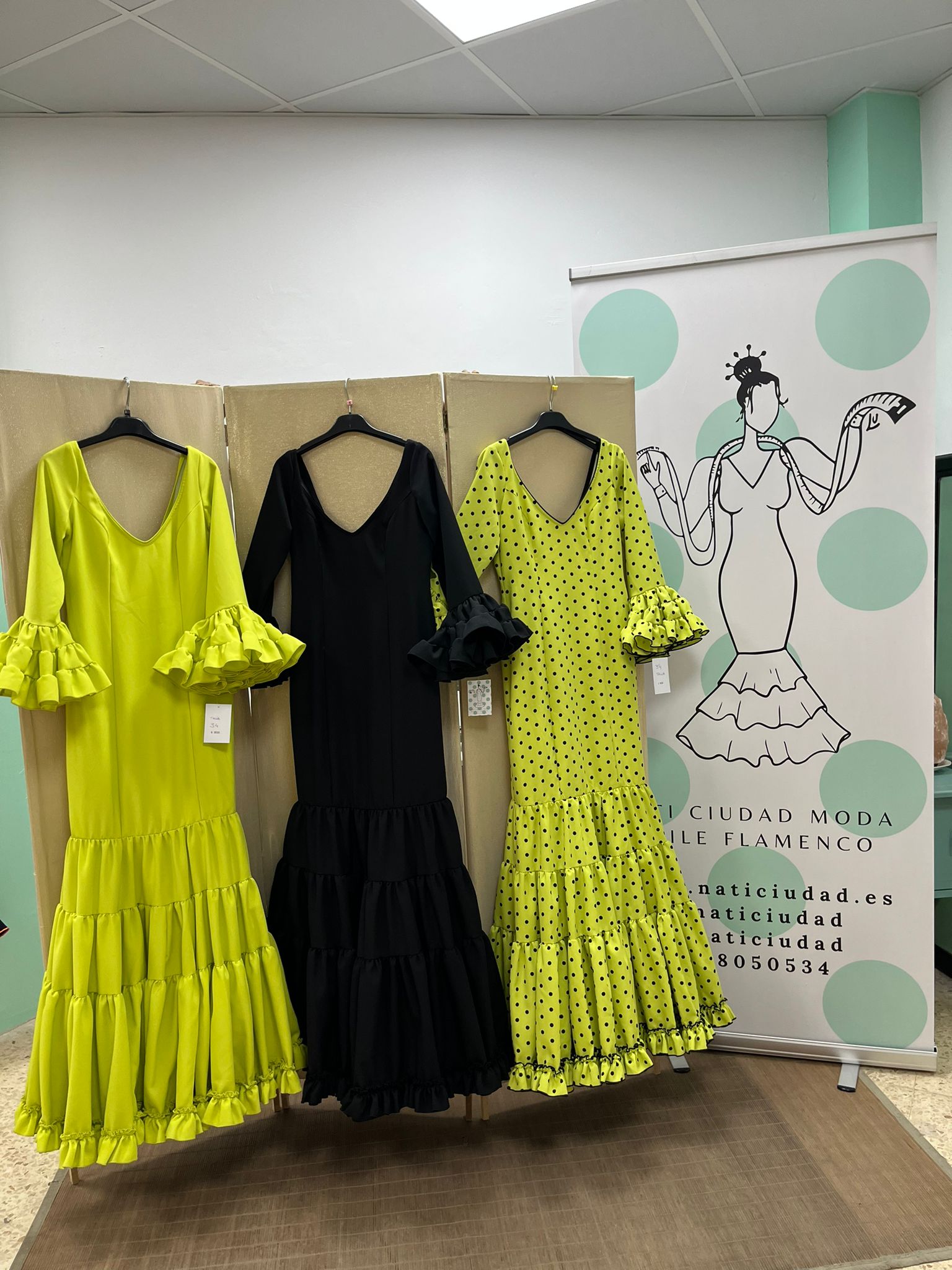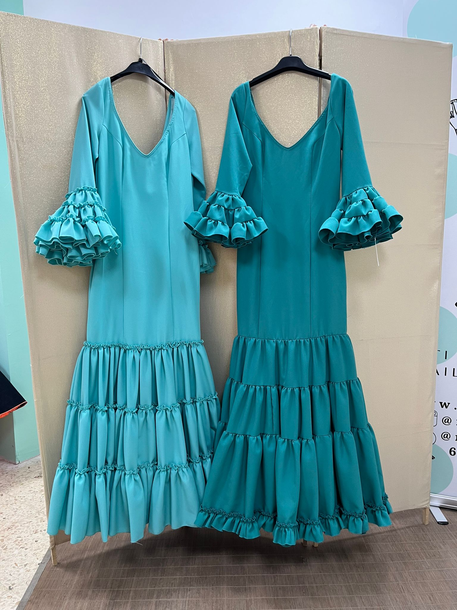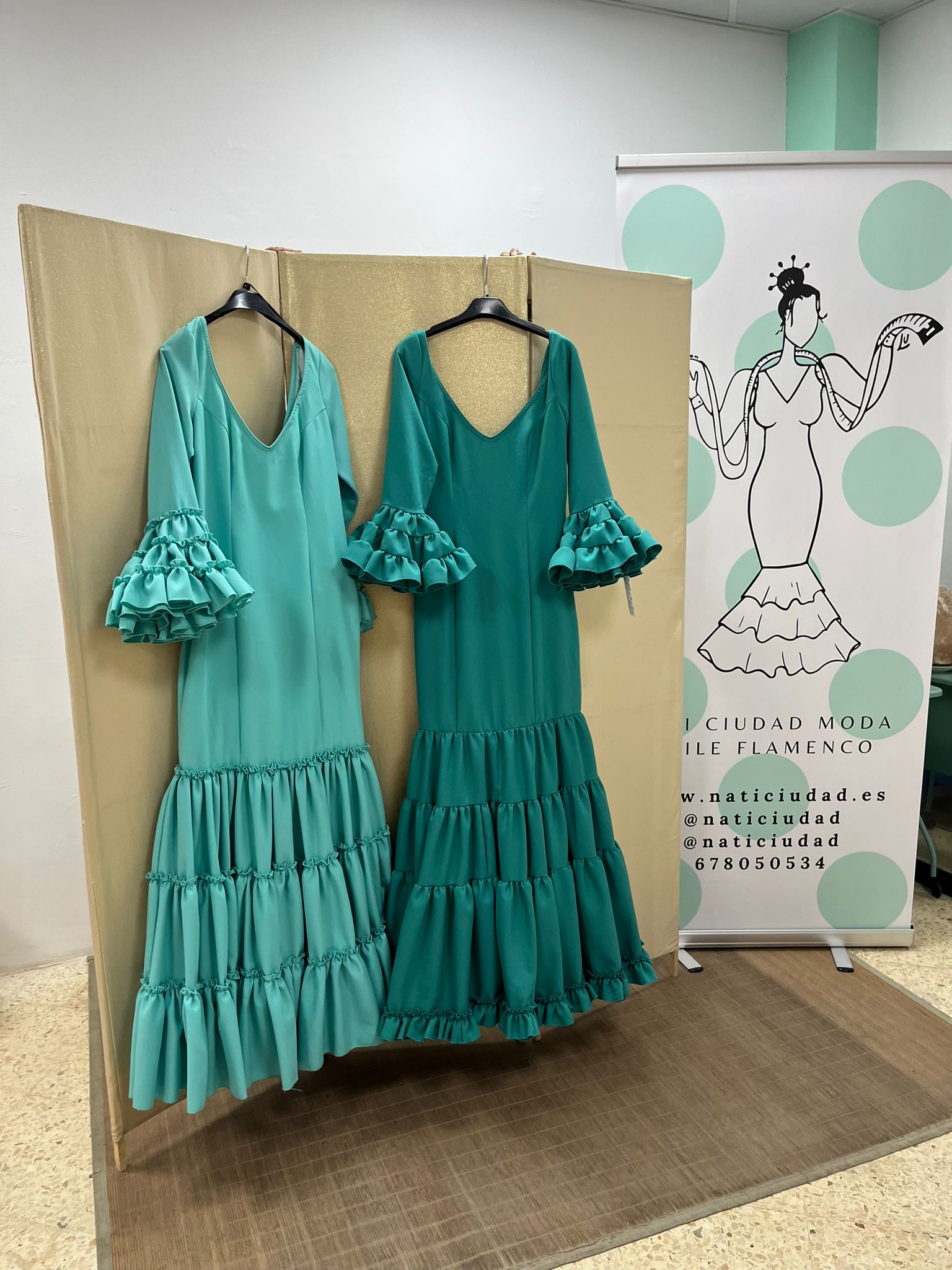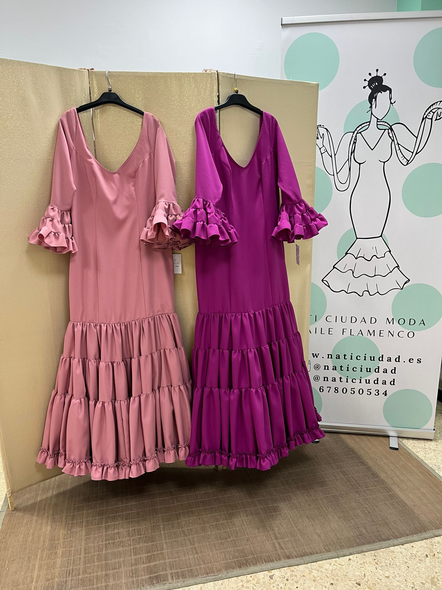 CANASTERO TEJIDO STRECH, CON MANGA AL CODO Y VOLANTE CANASTERO. CEÑIDO A LA CADERA Y VOLANTES CANASTEROS CON ENAGUAS Y BOLSILLO CON CREMALLERA TRASERA
