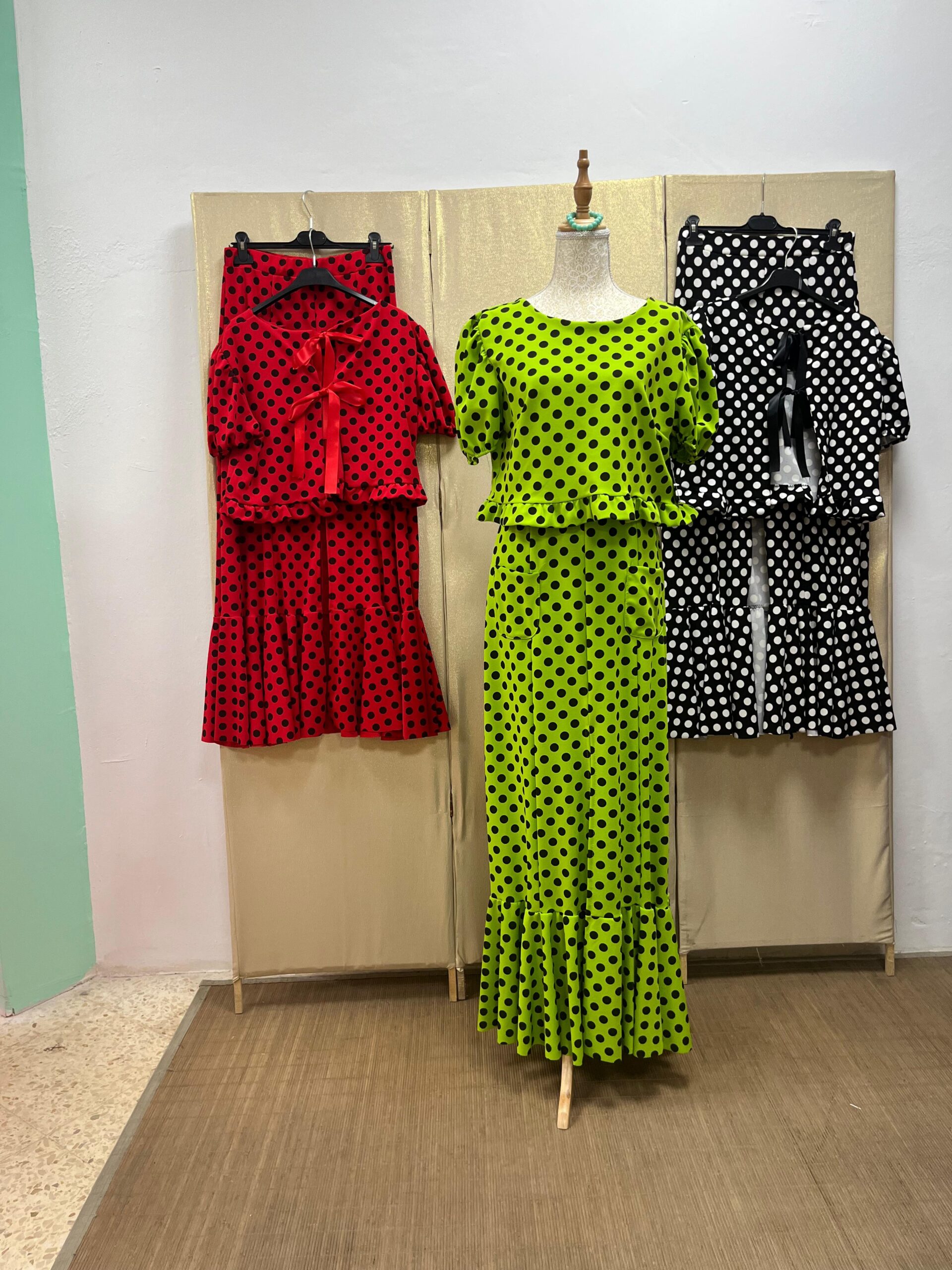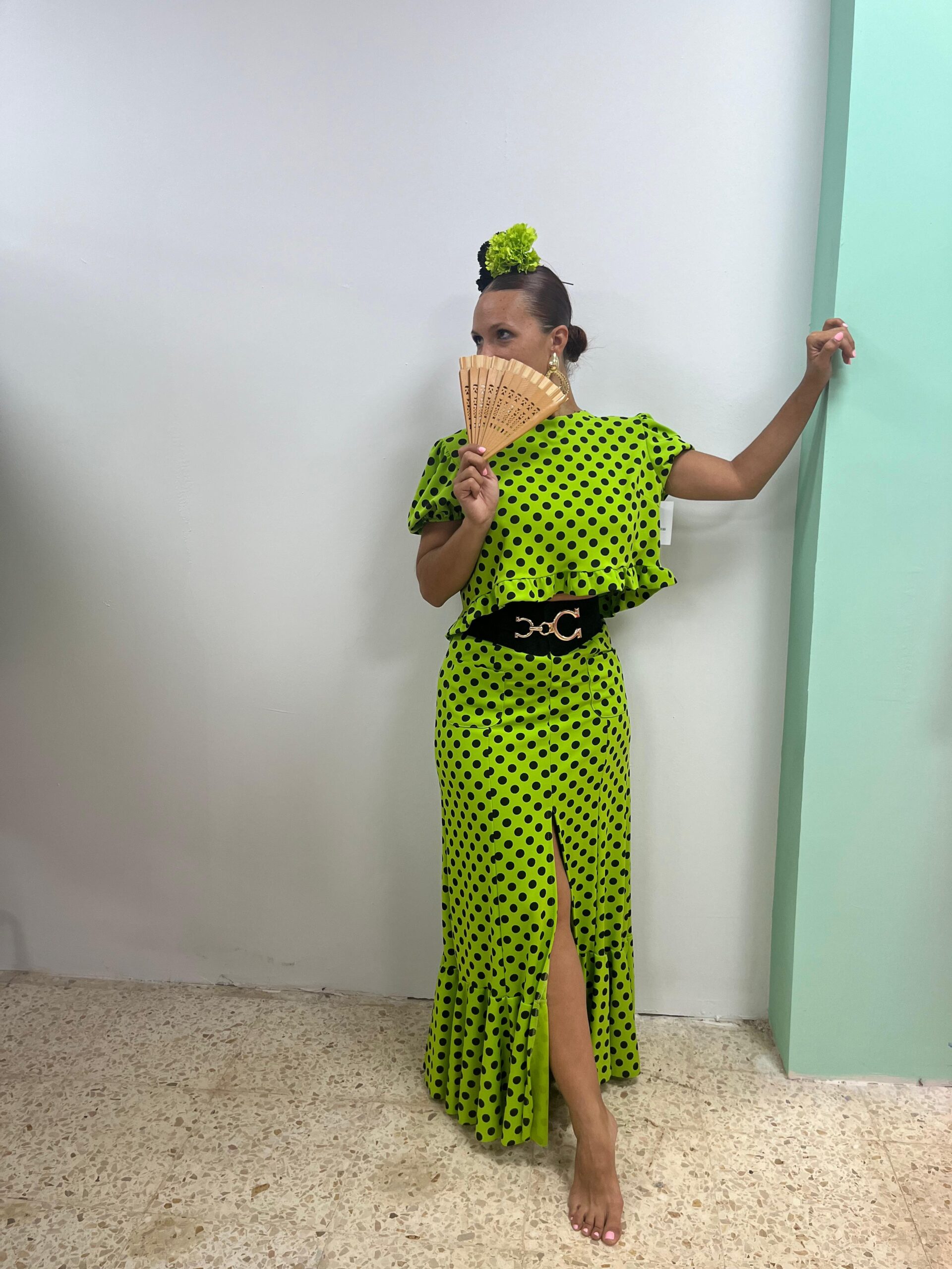 FALDA CON BOLSILLOS DELANTERO Y RAJA DELANTERA ELÁSTICA+ BLUSA MANGA ABULLONADA Y ESPALDA DESCUBIERTA CON LAZOS PARA SU CIERRE ELÁSTICA.