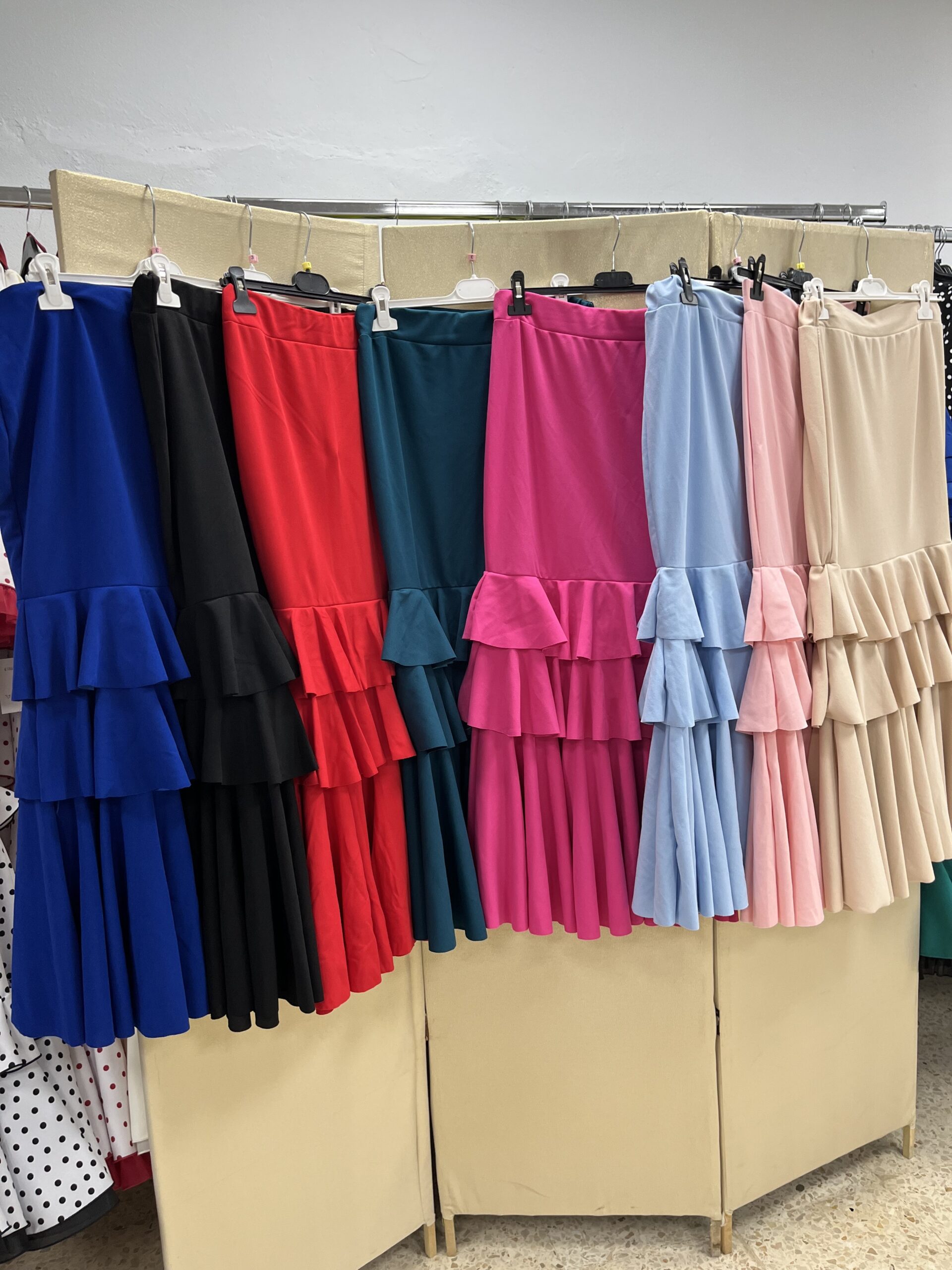 FALDA TEJIDO SCUBA CREP ELASTCA , MAXIMA COMIDIDAD , NO SE ABRE EL LUNAR CON LA AMPLITUD , COLORES UNICOS BEIG Y CORAL. 3 VOLANTES