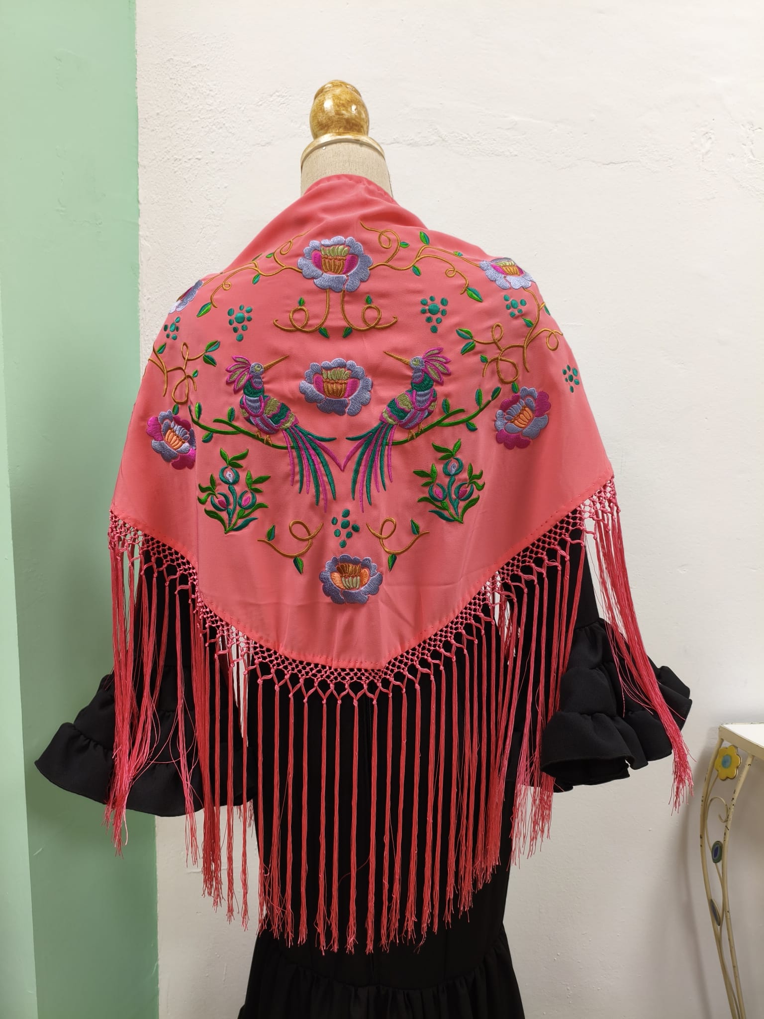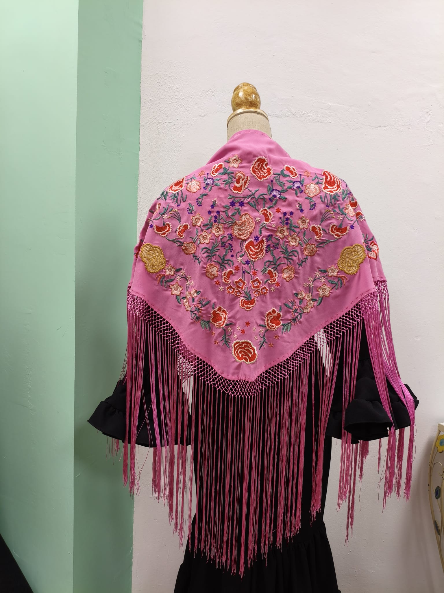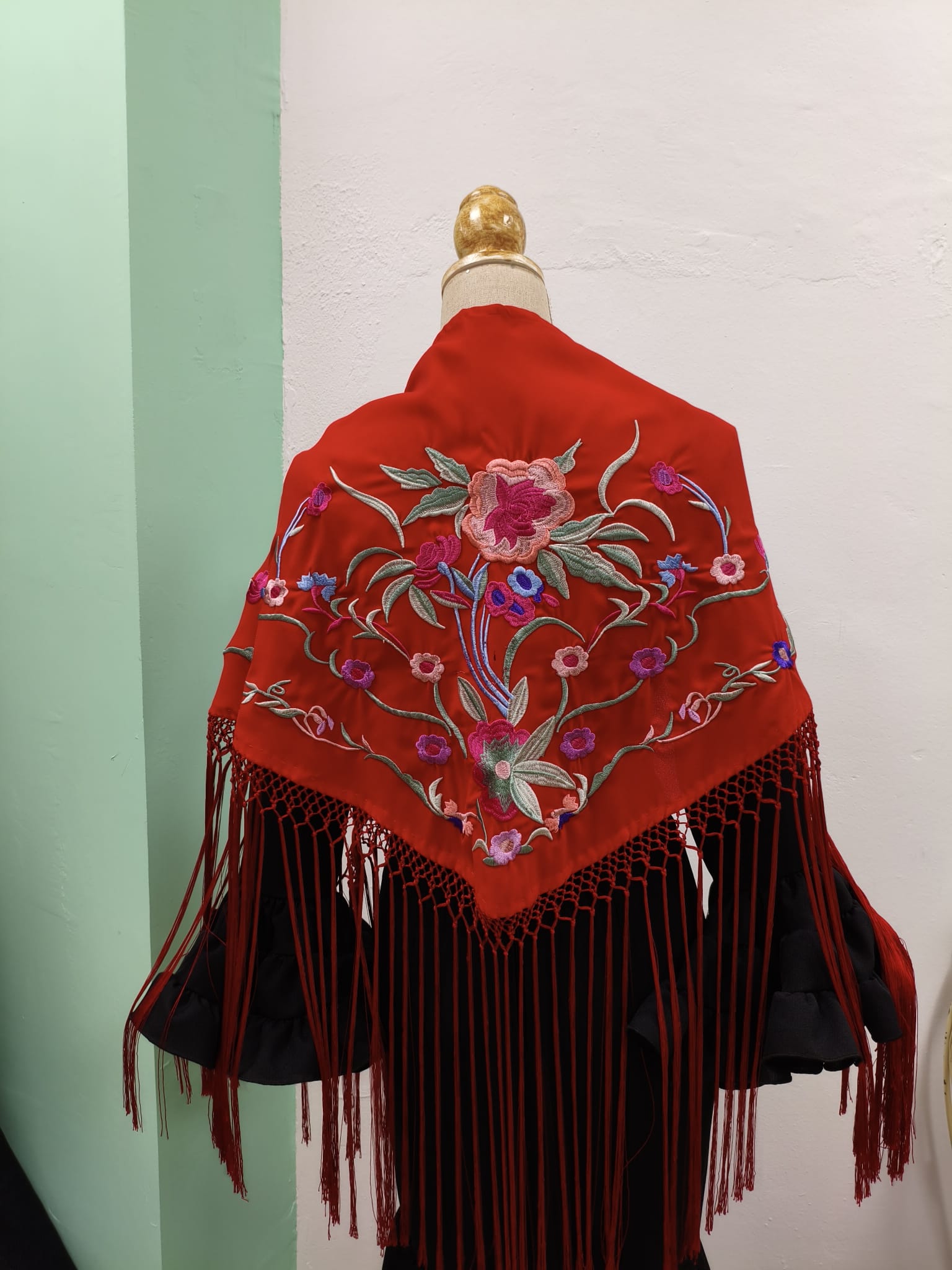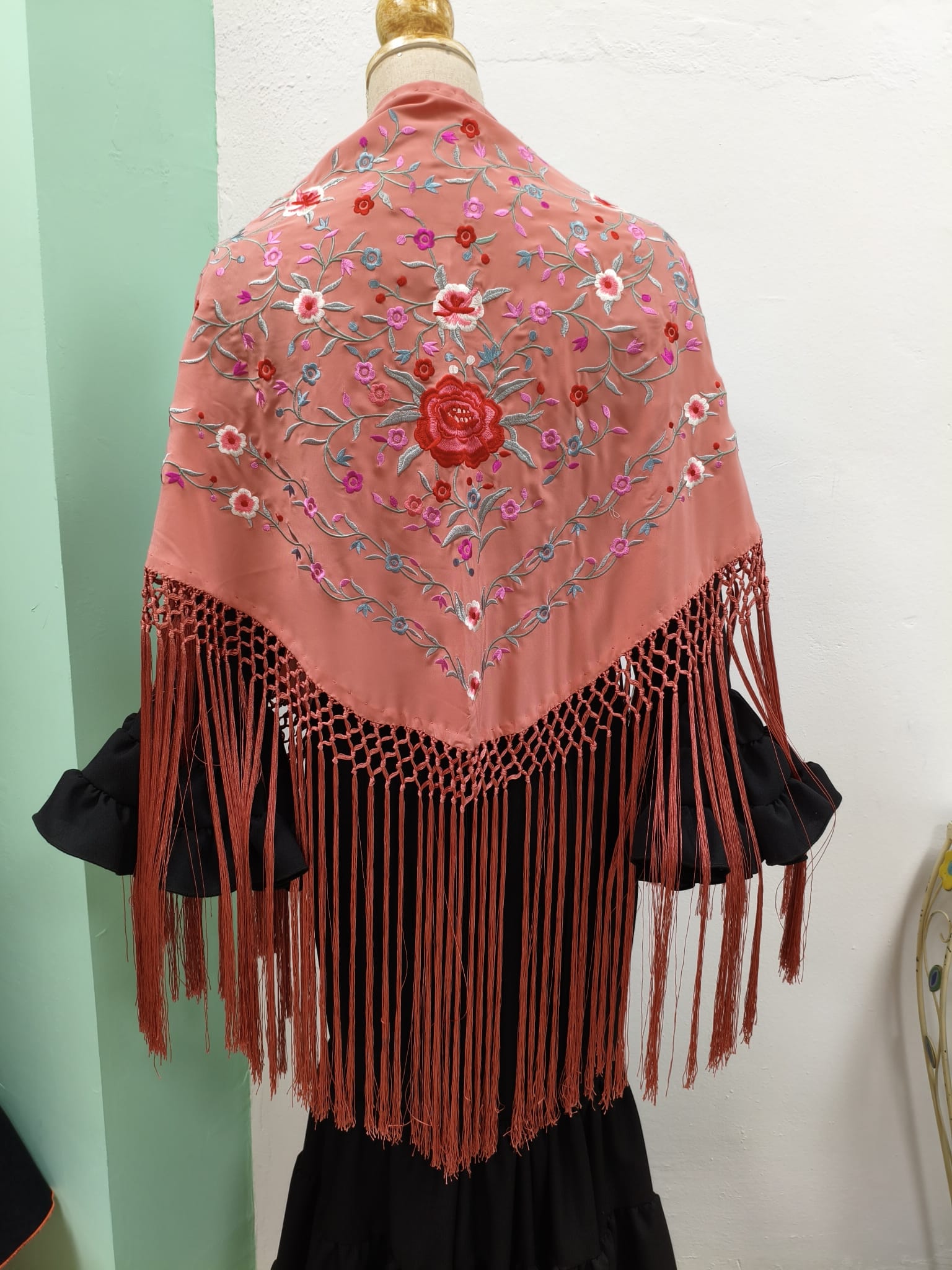 MANTON BORDADO Y FLECADO CON FLECOS MEDIO LARGOS, ESTILO Y ELEGANCIA.
