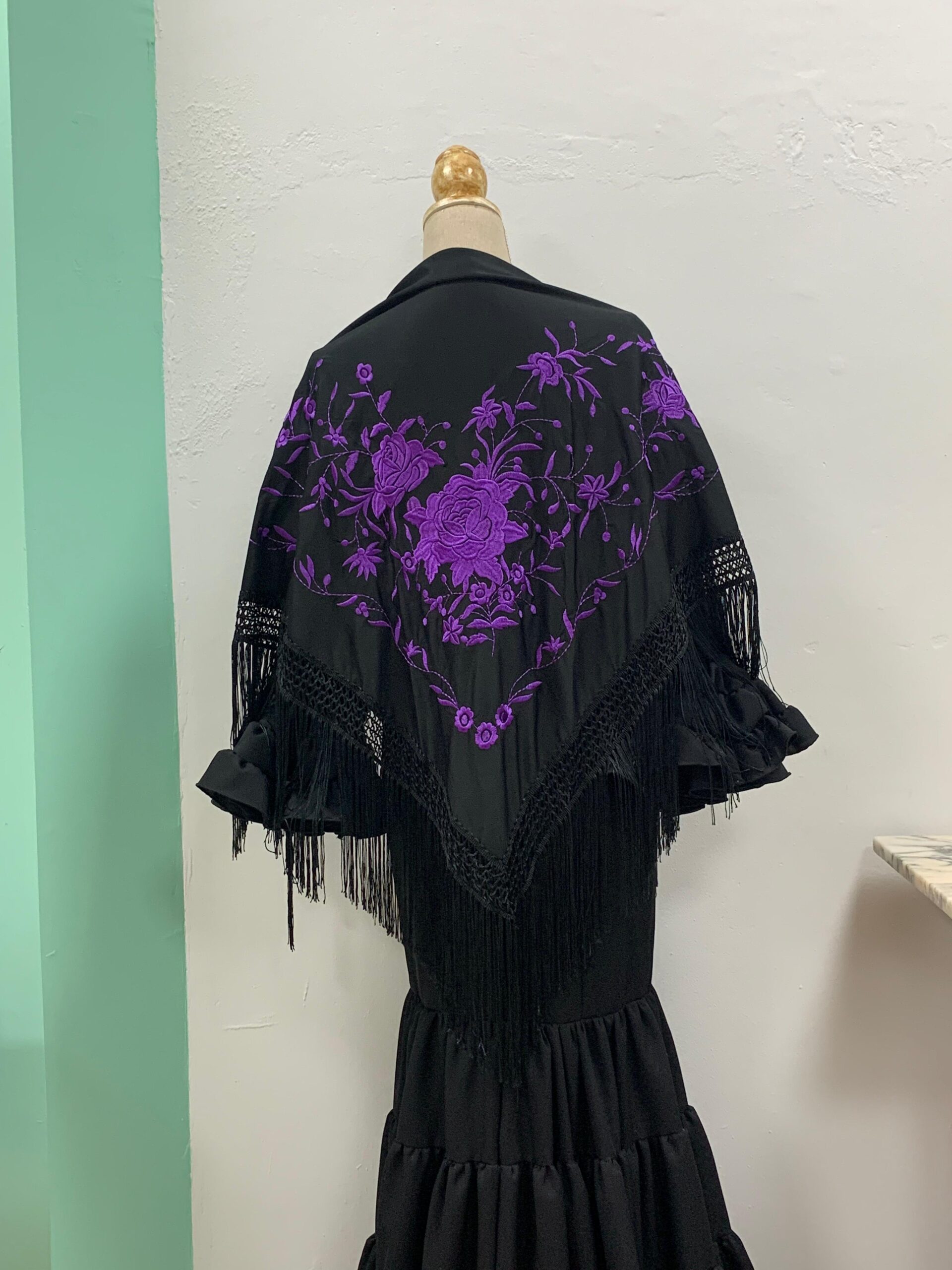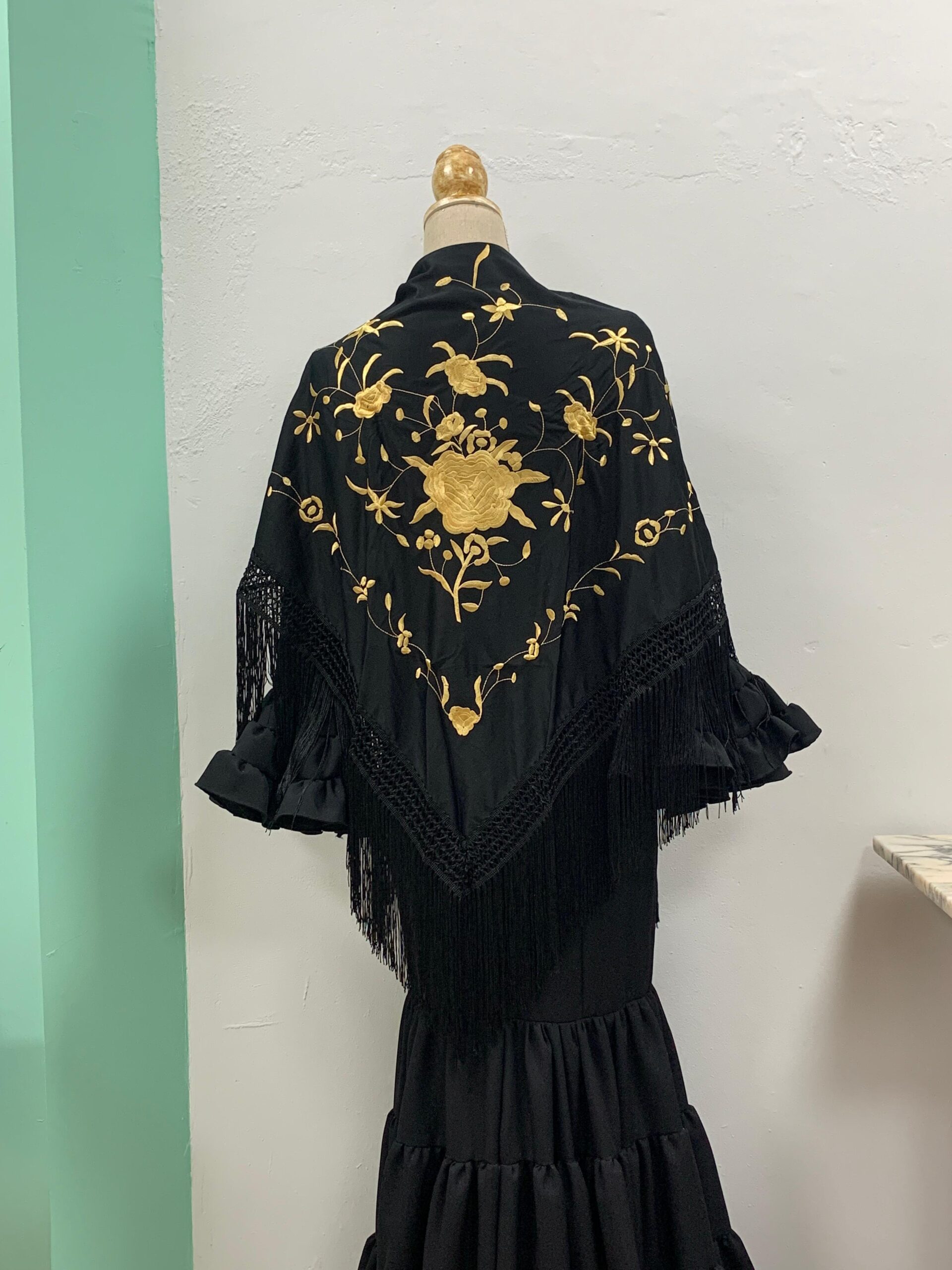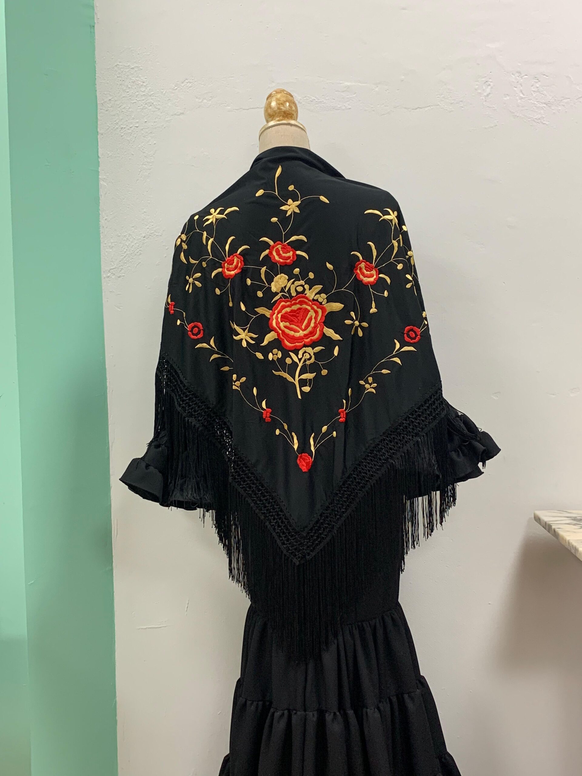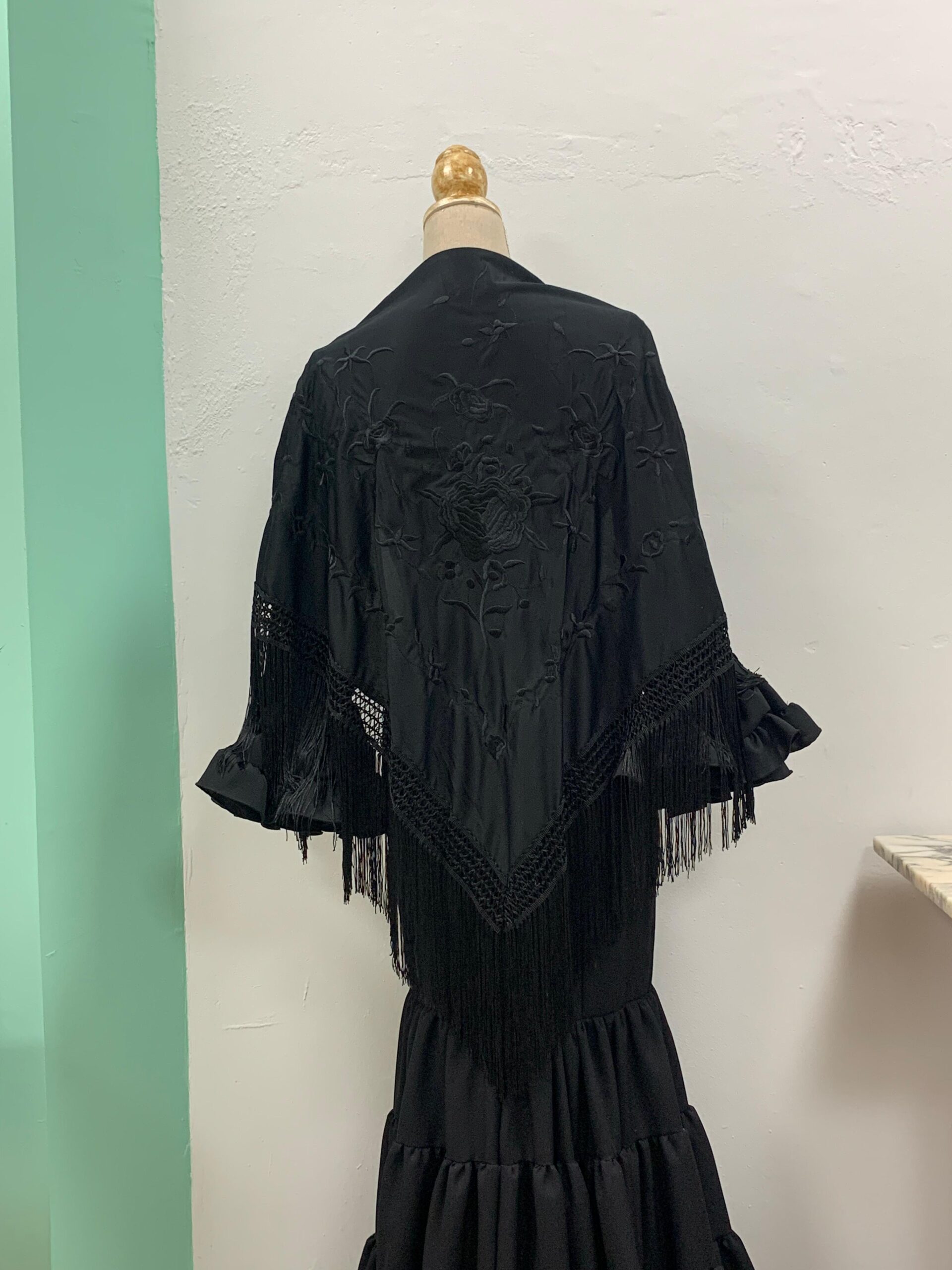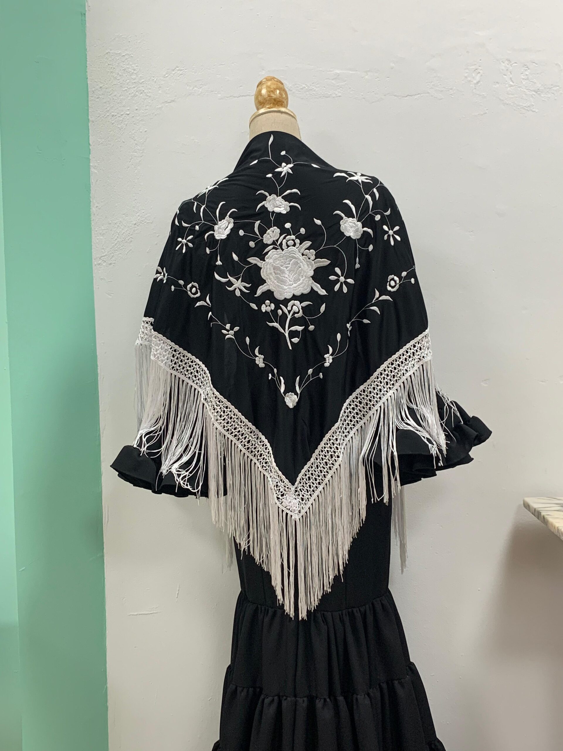Mantón negro punto de 1.35 cm x 0.76 cm + flecos de 18 cm,