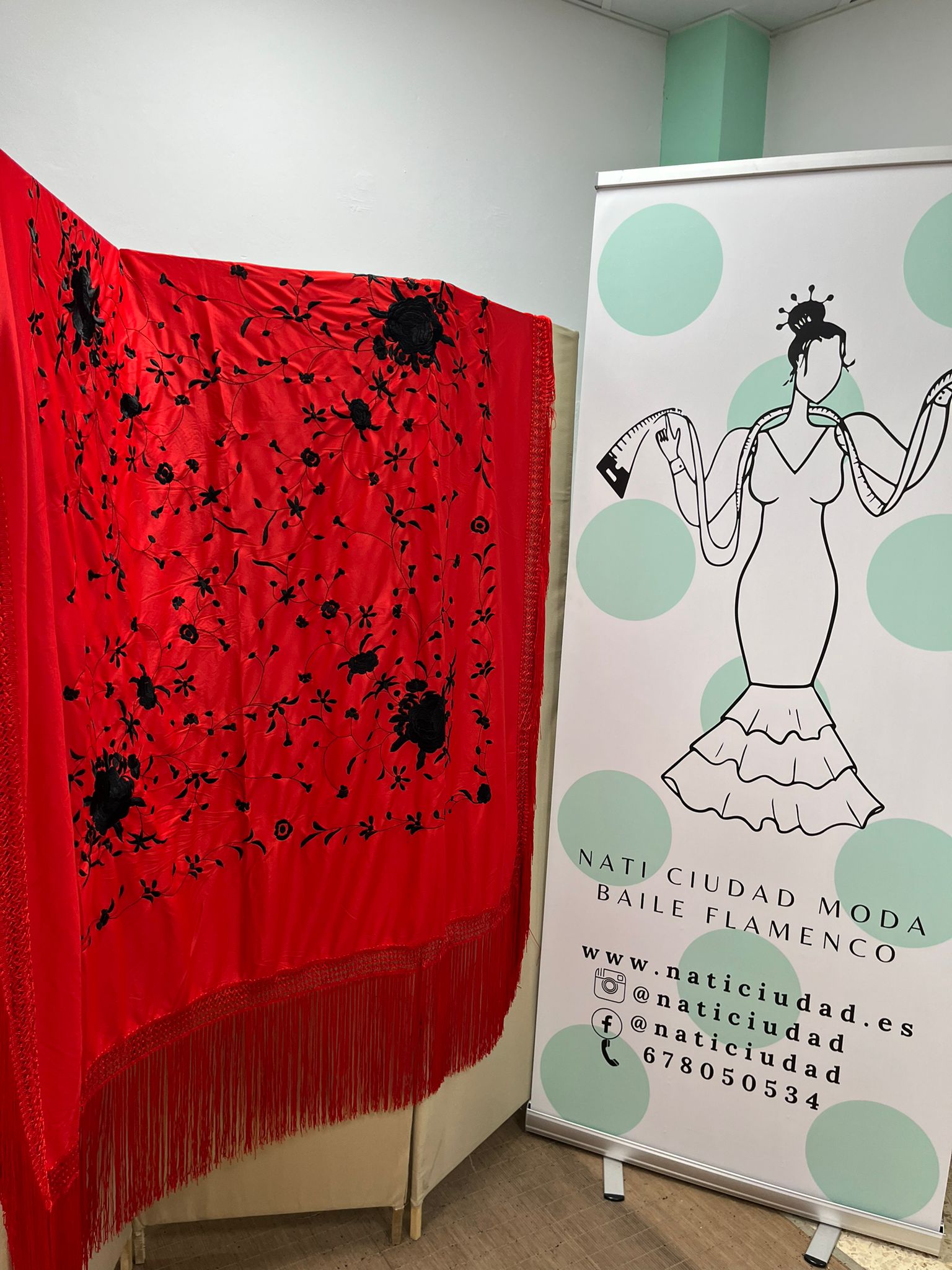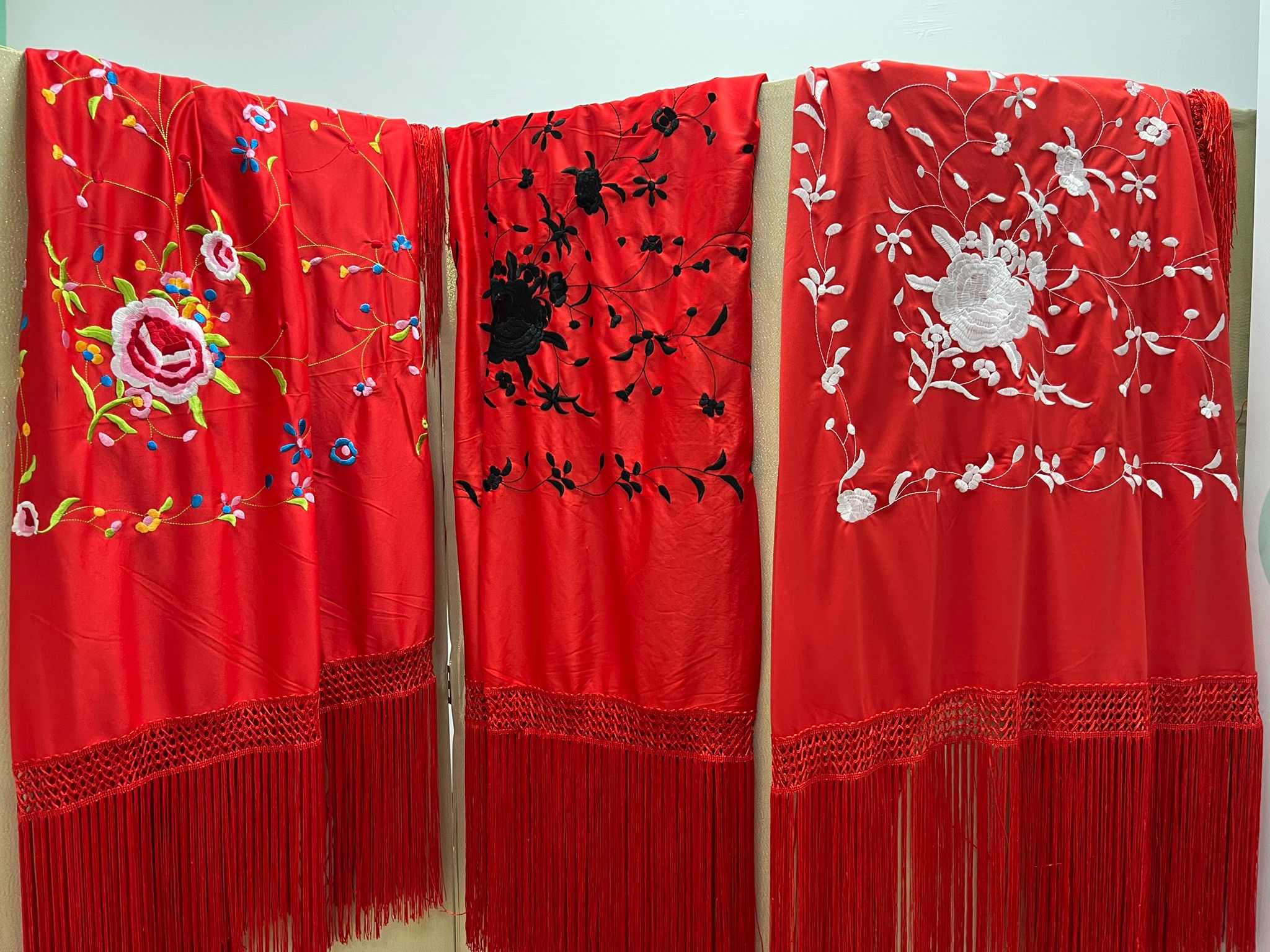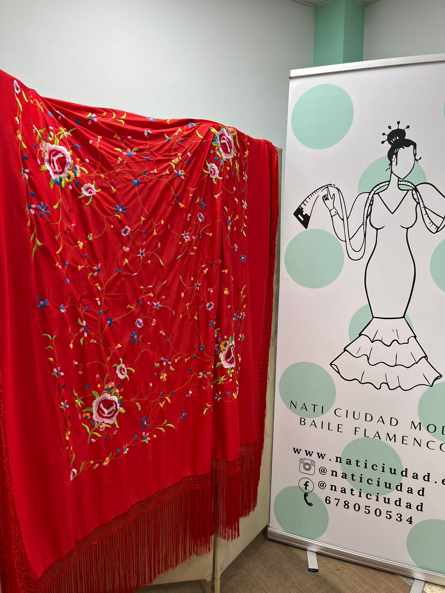 MANTON 150X150 DE BAILE CON FLECO 35CM TEJIDO DE PUNTO Y FLOR BORDADA .