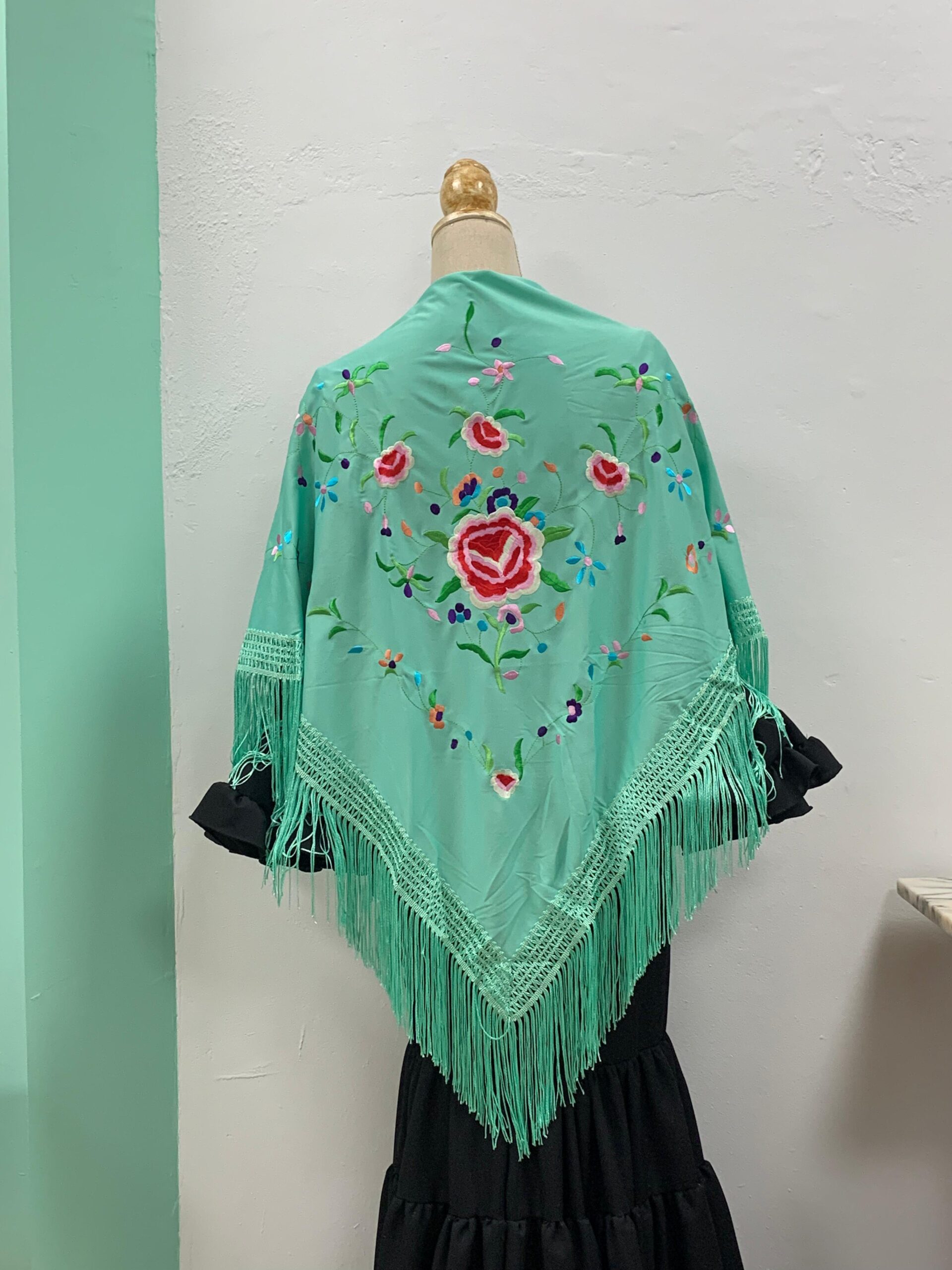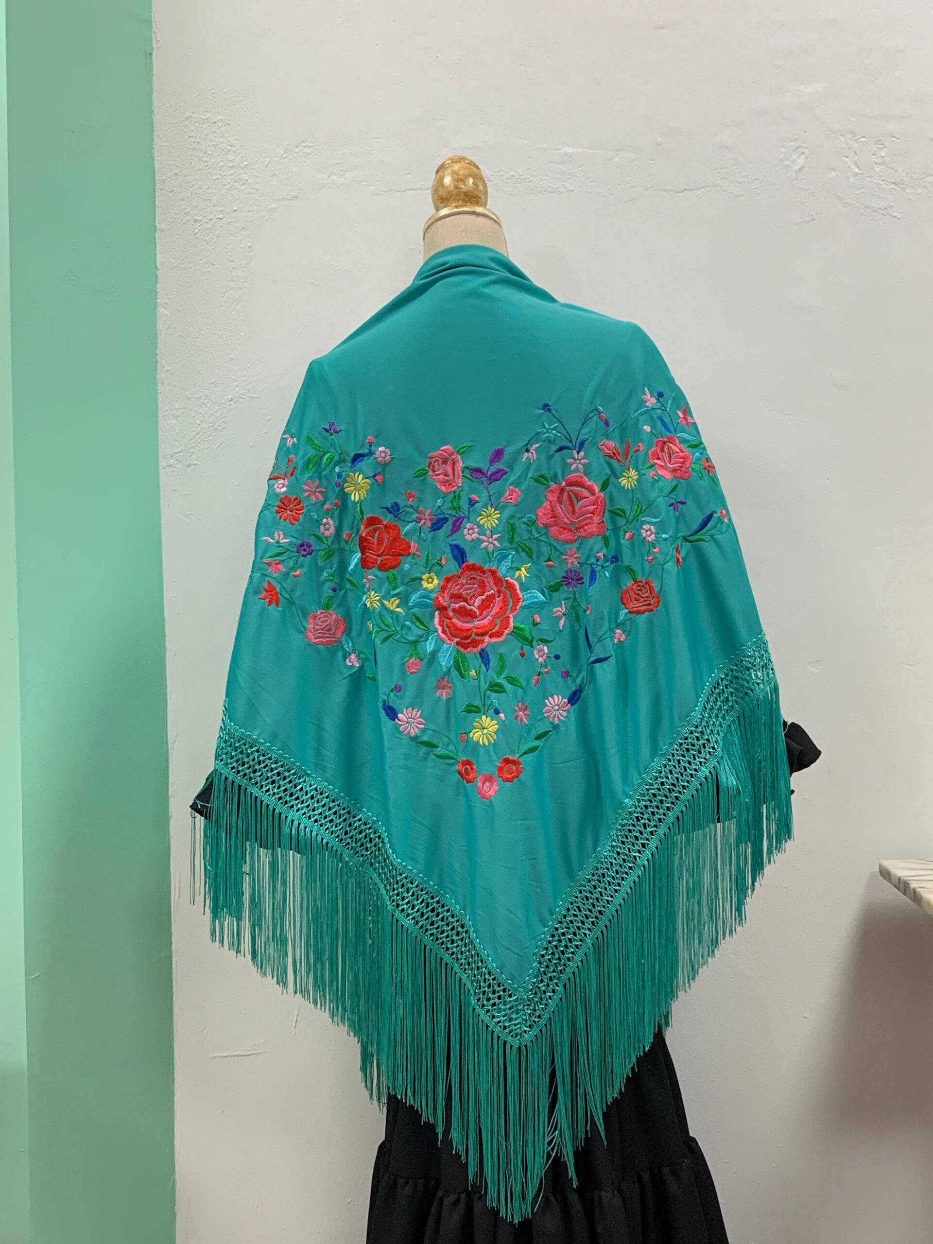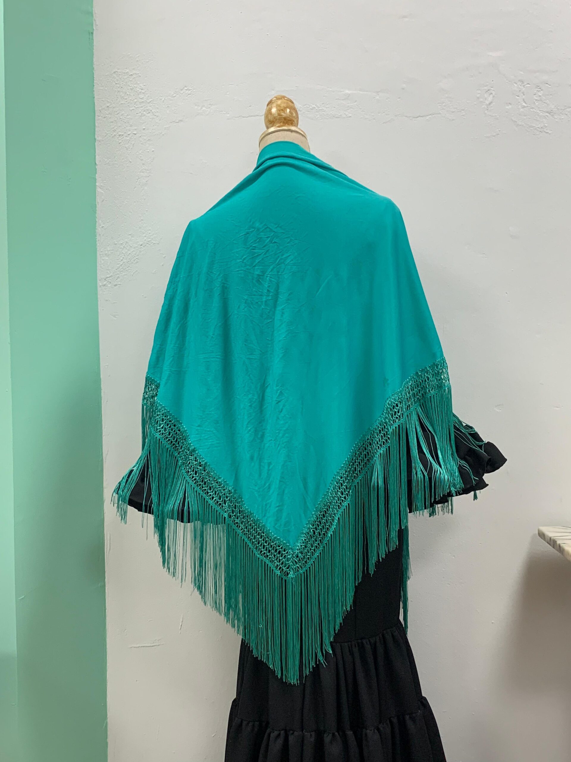 Mantón turquesa punto de 1.35 cm x 0.76 cm + flecos de 18 cm
